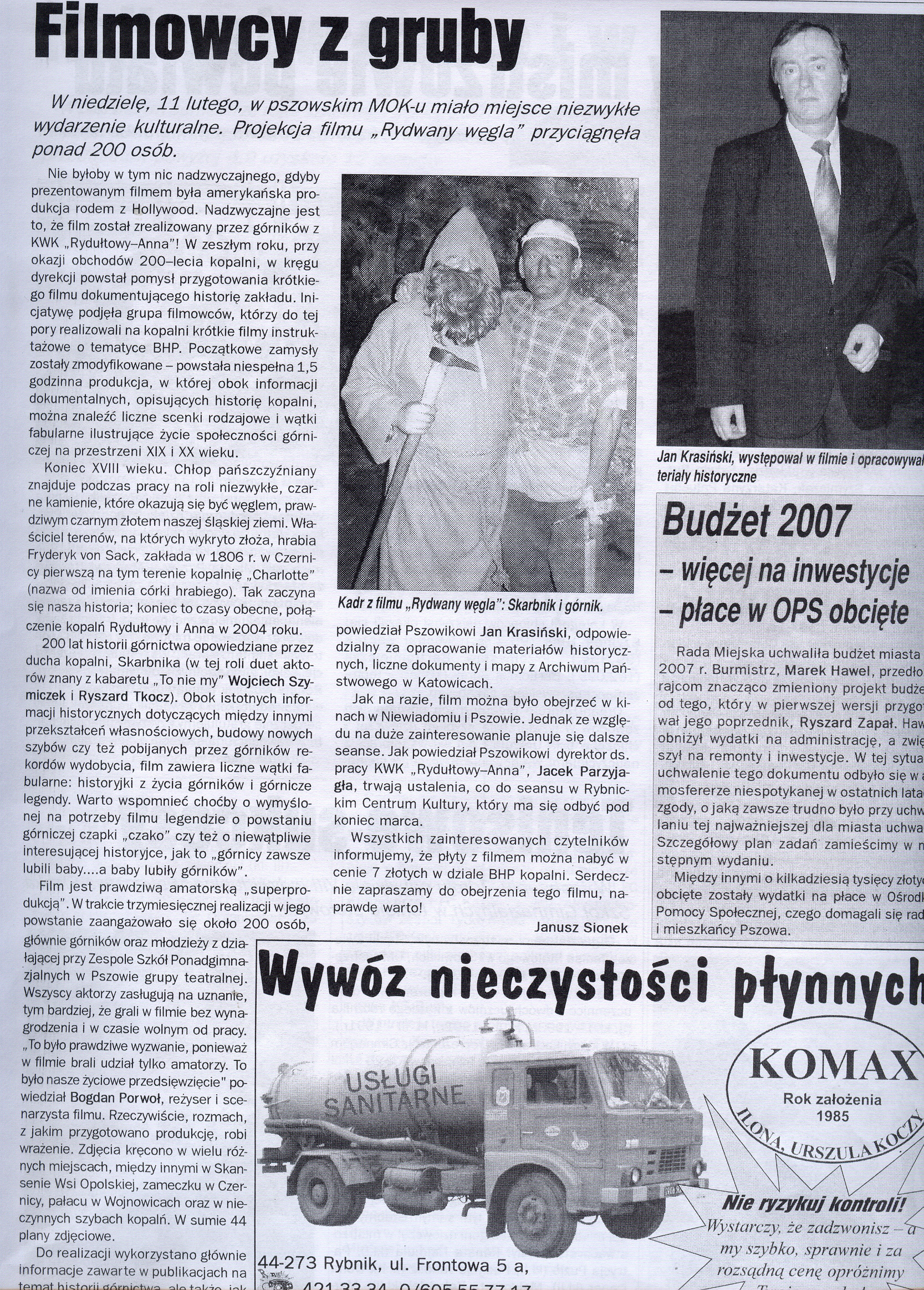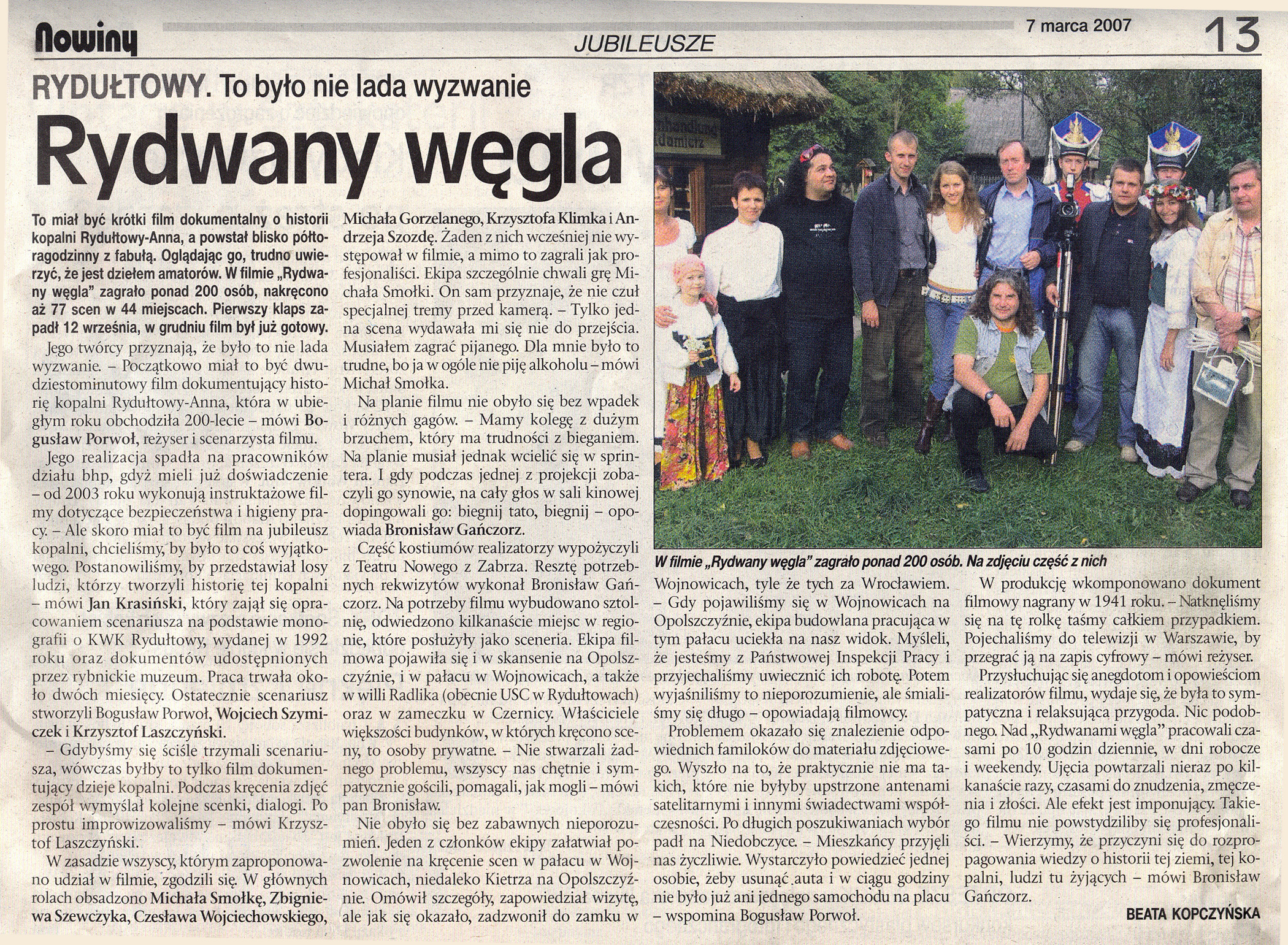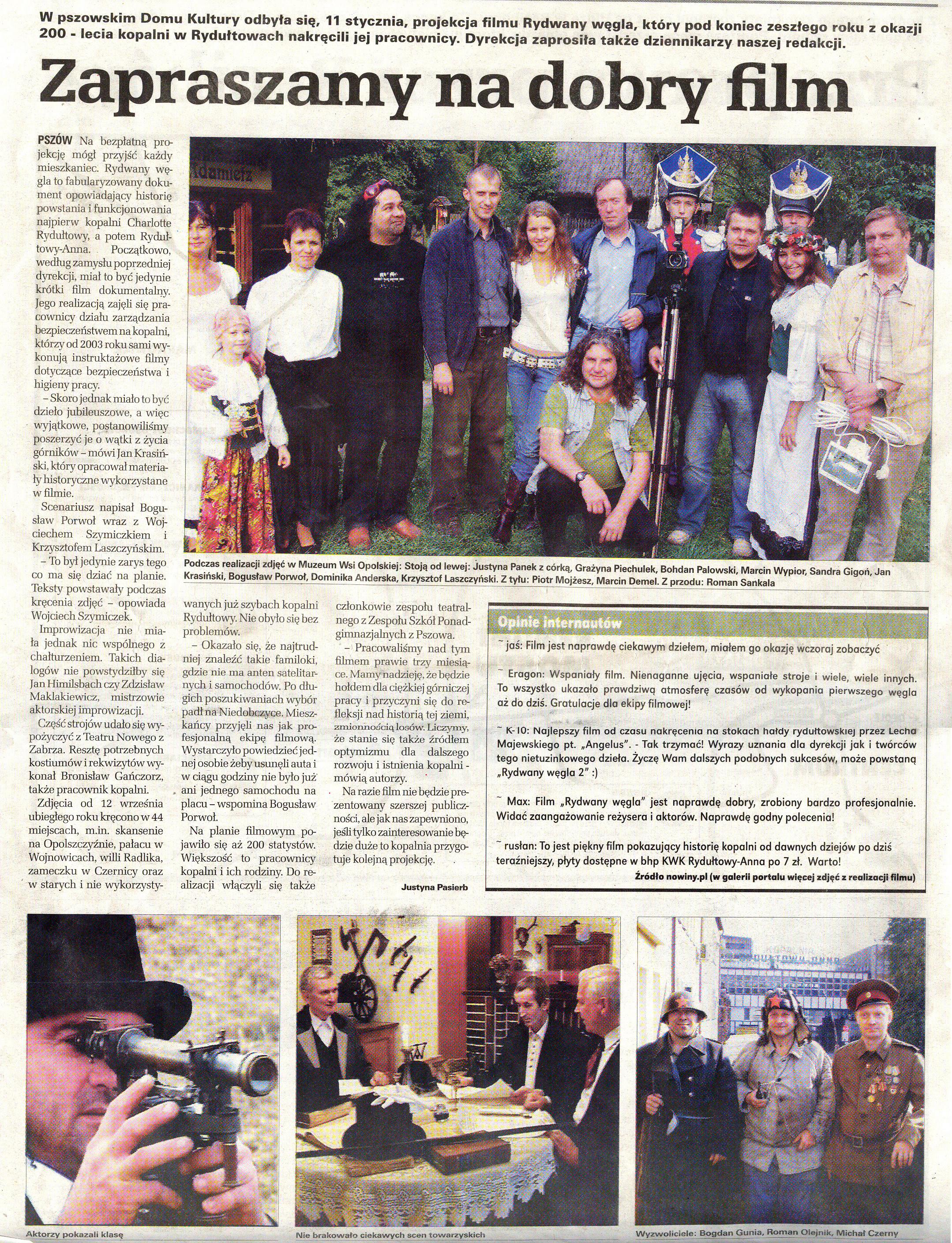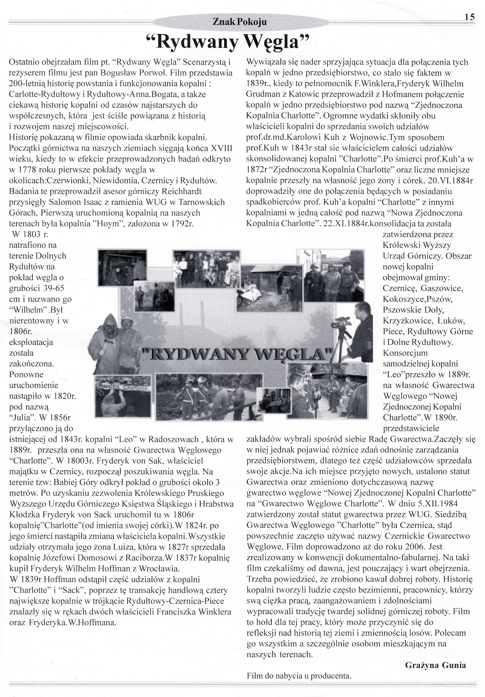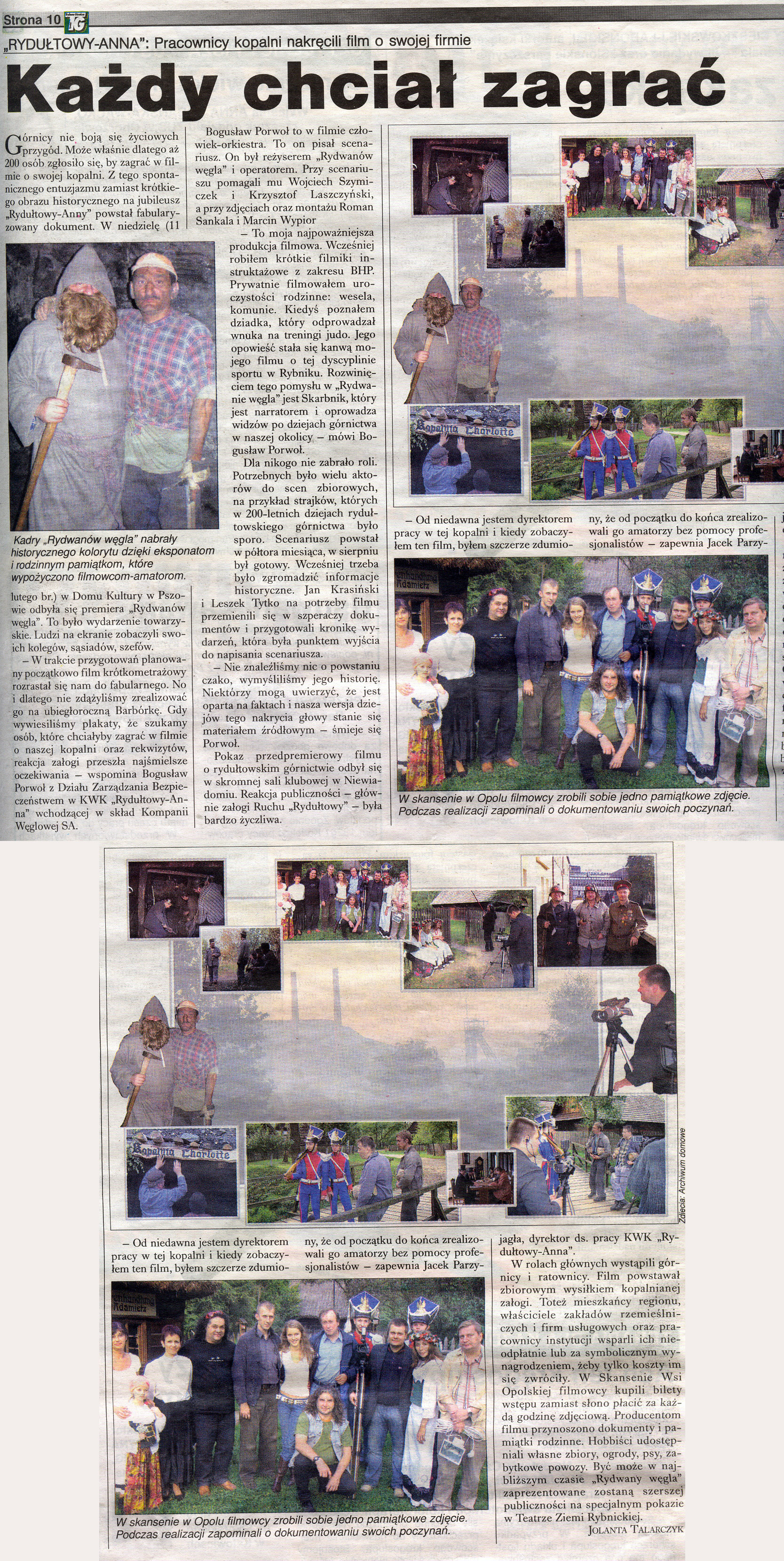 Nie byłoby w tym nic nadzwyczajnego, gdyby prezentowanym filmem była amerykańska produkcja rodem z Hollywood. Nadzwyczajne jest to, że film został realizowany przez górników z KWK "Rydułtowy-Anna"! W zeszłym roku, przy okazji obchodów 200-lecia kopalni, w kręgu dyrekcji powstał pomysł przygotowania krótkiego filmu dokumentującego historię zakładu. Inicjatywę podjęła grupa filmowców, którzy do tej pory realizowali na kopalni krótkie filmy instruktażowe o tematyce BHP. Początkowe zamysły zostały zmodyfikowane - powstała niespełna 1,5 godzinna produkcja, w której obok informacji dokumentalnych, opisujących historię kopalni, można znaleźć liczne scenki rodzajowe i wątki fabularne ilustrujące życie społeczności górniczej na przestrzeni XIX i XX wieku.